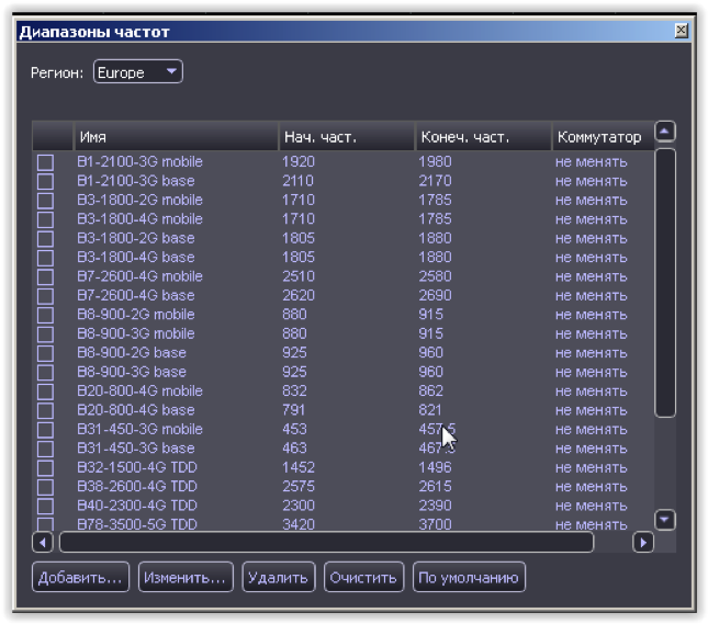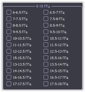 Диапазоны Эта опция предназначена для просмотра заранее установленных диапазонов частот. Установкой галочек можно выбрать полосы частот, относящиеся к стандартам сотовой связи и беспроводной передачи данных Обеспечена одновременная индикация выбранных стандартов/диапазонов в окне «Весь диапазон». |