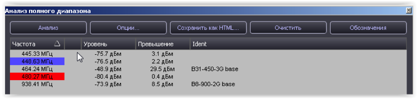 Анализ Анализ заключается в сравнении спектра, отображаемого на панели "ВЕСЬ ДИАПАЗОН", с пороговым значением заданным пользователем в режиме реального времени. Сигналы, превысившие данный порог формируют список сигналов.