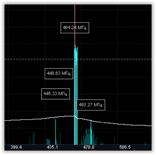 Нажатие на кнопку "Анализ" инициирует проведение однократного анализа спектра с появлением списка сигналов, превысивших заданный порог. Индикация спектра меняет свой вид: весь спектр становится полупрозрачным, а обнаруженные сигналы отображаются обычным образом с индикацией пиковой частоты. |
