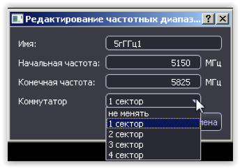 Кнопка «Добавить…» вызывает окно позволяющее создать строку с новым диапазоном. Кнопка «Изменить…», при выделении соответствующего диапазона, вызывает окно, позволяющее изменить параметры, включая возможность выбора входа антенного коммутатора. Первому входу присваивается название «Первый сектор» второму – второй.. Это позволяет, например, создать четырех секторную пеленгаторную систему |