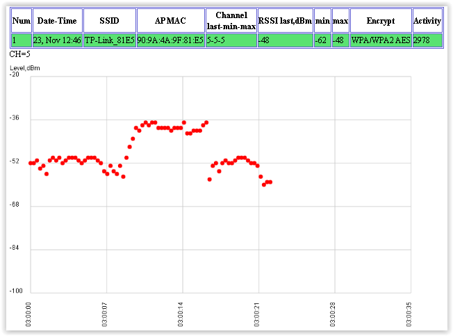 Отображается строка с параметрами выбранной AP, STA или Bluetooth с добавлением графического представления уровня сигнала.