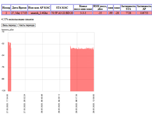 Отображается история активности во времени выбранной AP, STA или BT.