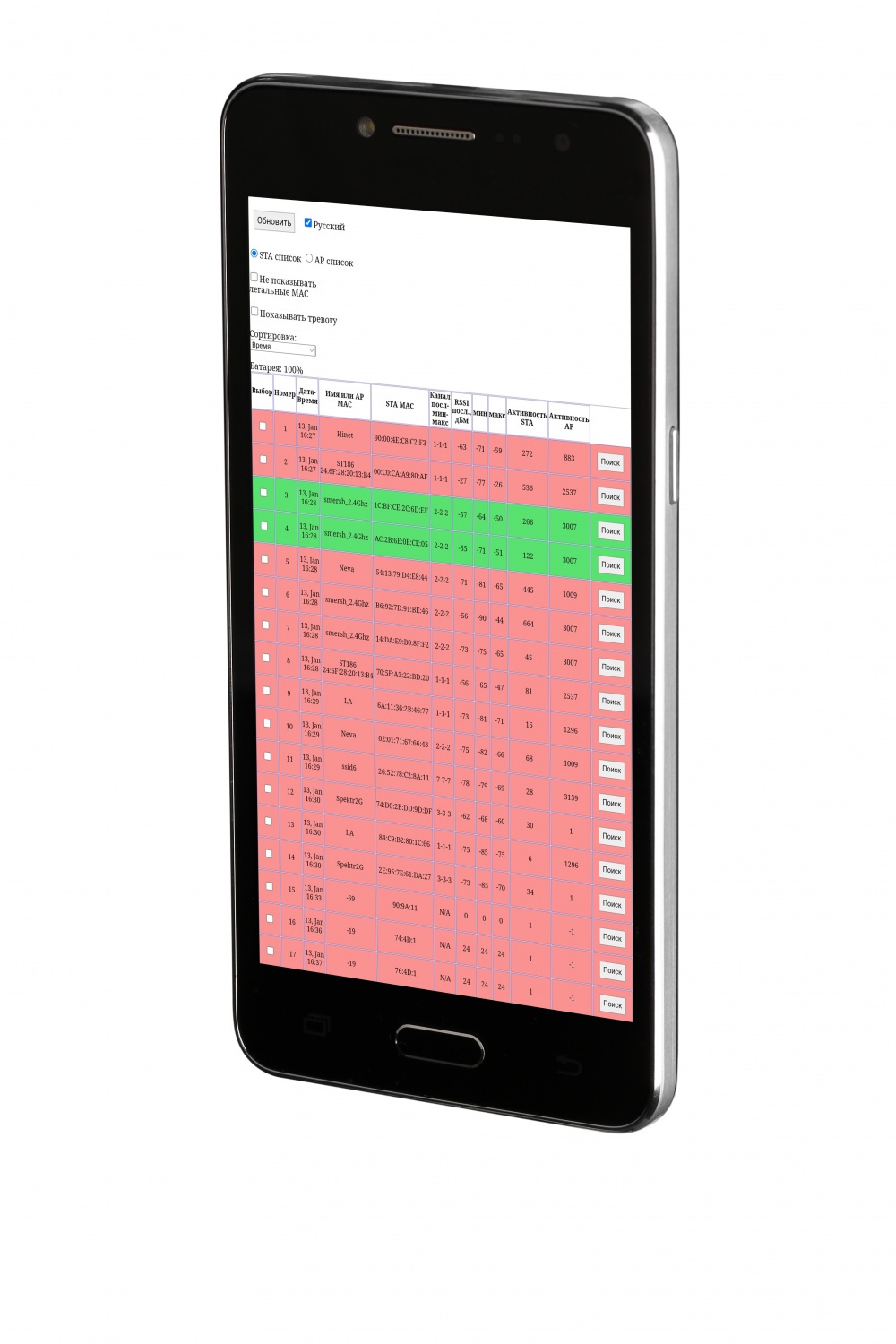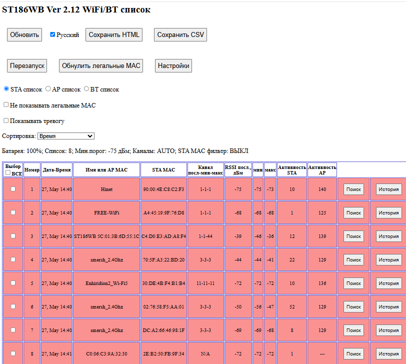 - Создание списка точек доступа Wi-Fi и подсоединенных к ним устройств (клиентов) стандартов 802.11 a/b/g/n/ac/k/,