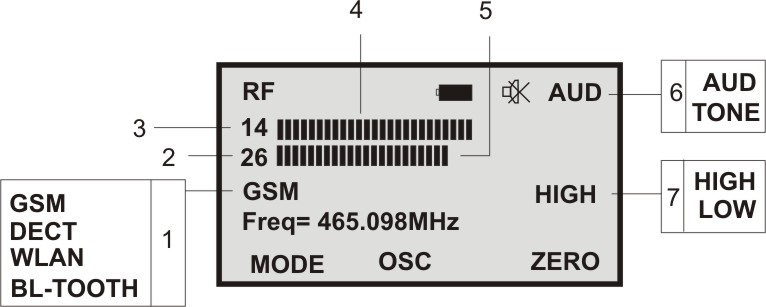 The device will advise you if the detection of a GSM, DECT, WLAN or BLUETOOTH signal takes place.