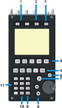 "+" and "-" increase/decrease of display brightness level and switching between the bands |